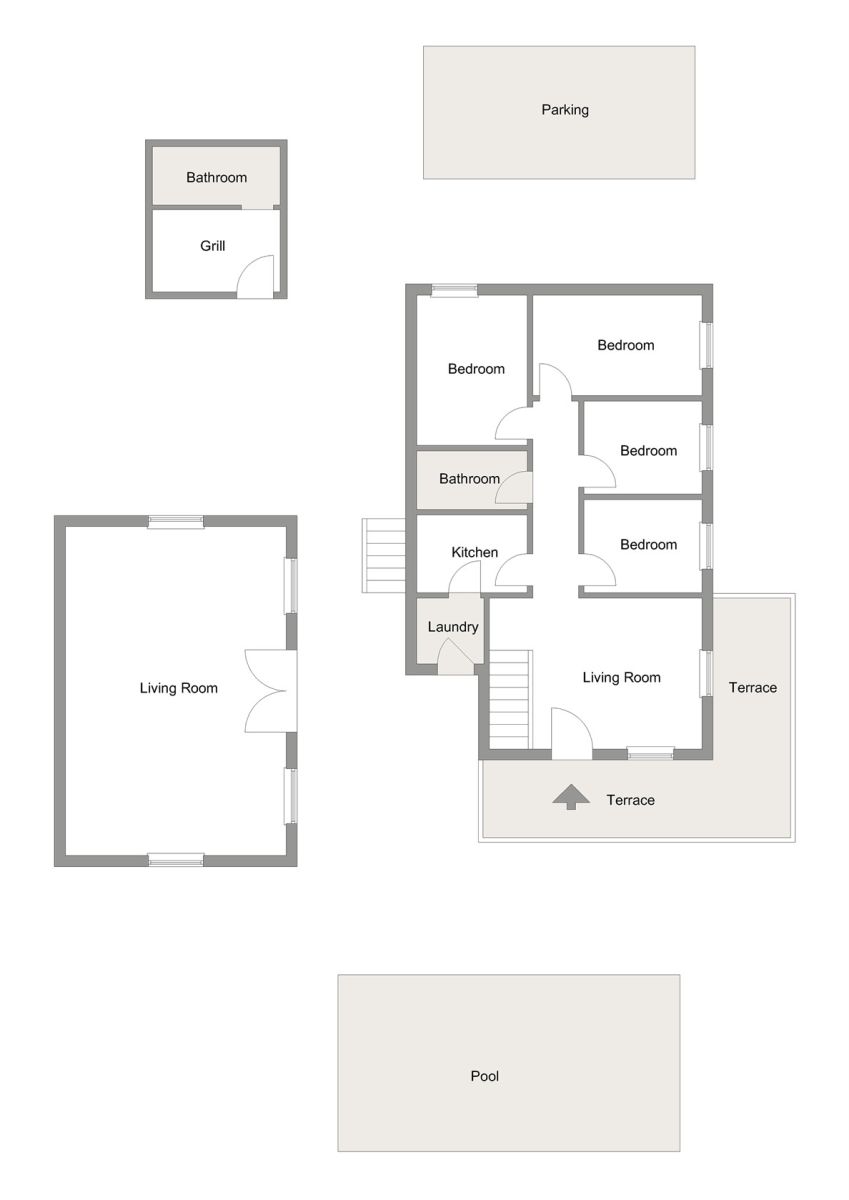 Główna willa ma cztery przestronne sypialnie, z których trzy mają miejsce na podwójne łóżko i szafy, a jedna ma miejsce na pojedyncze łóżko i szafę. Cała willa jest bardzo jasna i urocza dzięki tradycyjnym drewnianym detalom. Jest zadbana, ale może wymagać aktualizacji, aby uzyskać bardziej nowoczesny charakter. Salon jest przestronny i jest w nim miejsce na dużą sofę i jadalnię. Jest też duży kominek. Kuchnia znajduje się oddzielnie i ma wiele szafek i dobre opcje przechowywania, a także duże obszary robocze do pracy. Na dole znajduje się piwnica, która może być używana jako przestrzeń mieszkalna lub jako garaż, w zależności od potrzeb. Znajduje się tam oddzielna sypialnia i łazienka. W domku gościnnym, który znajduje się oddzielnie na działce, istnieją wszystkie możliwości podziału na więcej sypialni lub wykorzystania go tak, jak jest w tej chwili - duży ładny salon z kominkiem i dużymi grupami sof.