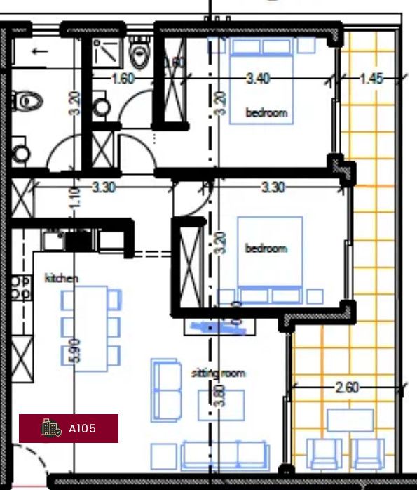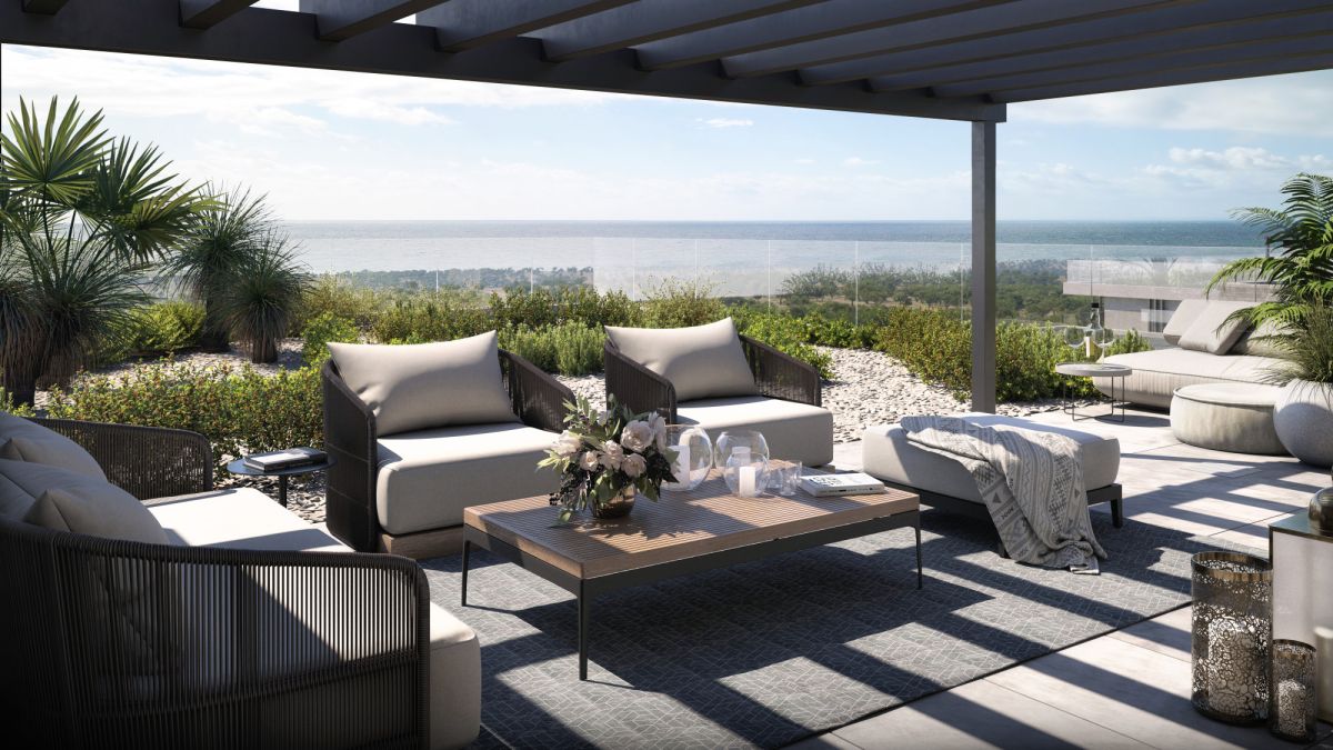 Apartamenty składający się z 2 sypialni, 2 łazienek, salonu otwartego na kuchnię oraz tarasu, został starannie wykonany i ma przestronne układy, dzięki czemu do pomieszczeń mieszkalnych dociera mnóstwo naturalnego światła. Wnętrza są gustownie urządzone przy użyciu wysokiej jakości wykończeń i armatury, tworząc otwartą i przestronną atmosferę.