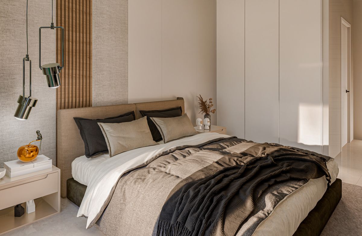 W apartamencie znajdują się dwie eleganckie sypialnie, każda z wygodnym łóżkiem i przestronną szafą. Wnętrze zostało gustownie urządzone w stonowanych kolorach, co tworzy przyjemną atmosferę relaksu i spokoju.