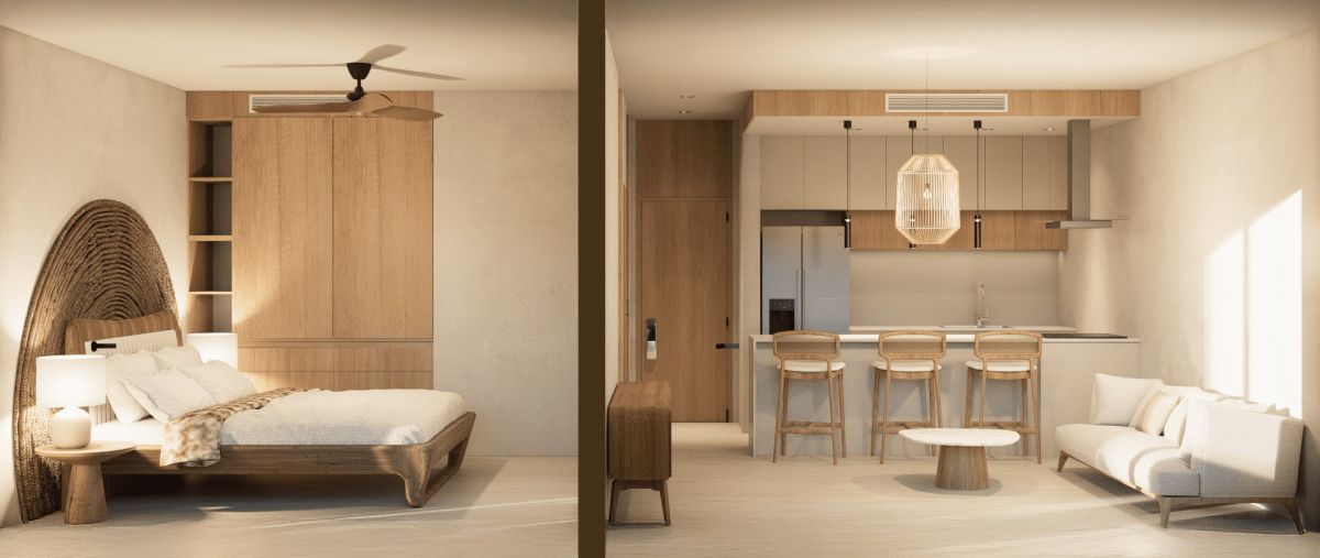 Zainteresowani mają do wyboru apartamenty z jedną i dwoma sypialniami oraz domki z trzema sypialniami. Apartamenty są wykończone w białej linii. Deweloper zadbał o pakiety meblowe, które może wybrać kupujący.