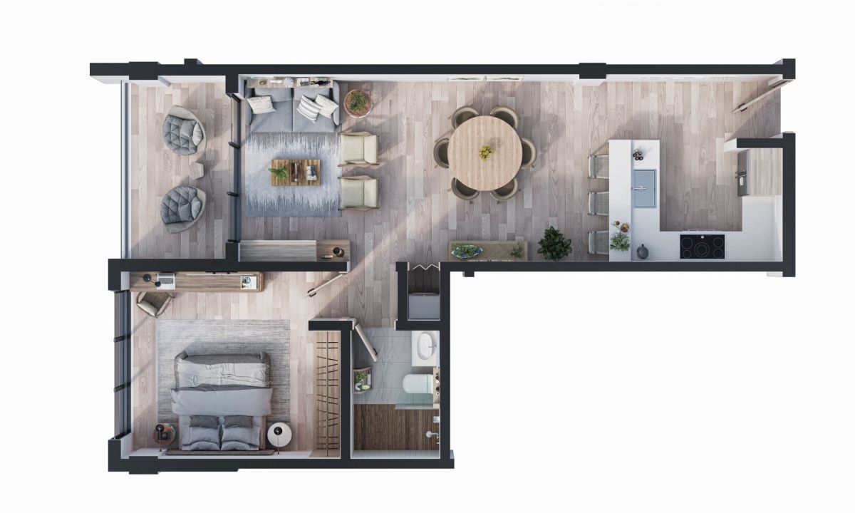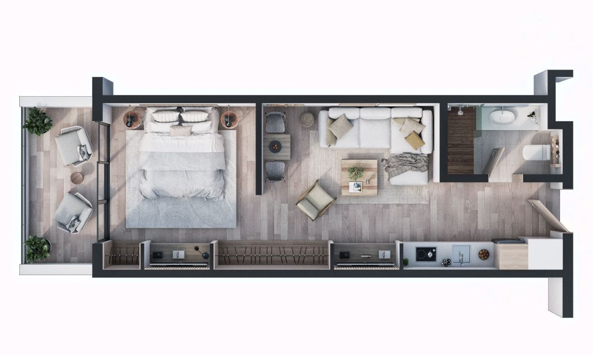Apartament o powierzchni około 70 m² został zaprojektowany z myślą o wygodzie i codziennym komforcie. Oferuje jedną sypialnię, łazienkę, przestronny salon połączony z kuchnią oraz balkon lub taras, który stanowi idealne miejsce na relaks. Wysoki standard wykończenia obejmuje gotowe ściany i podłogi, nowoczesną zabudowę kuchenną z dużym AGD, pralkę, suszarkę oraz klimatyzację we wszystkich pomieszczeniach.