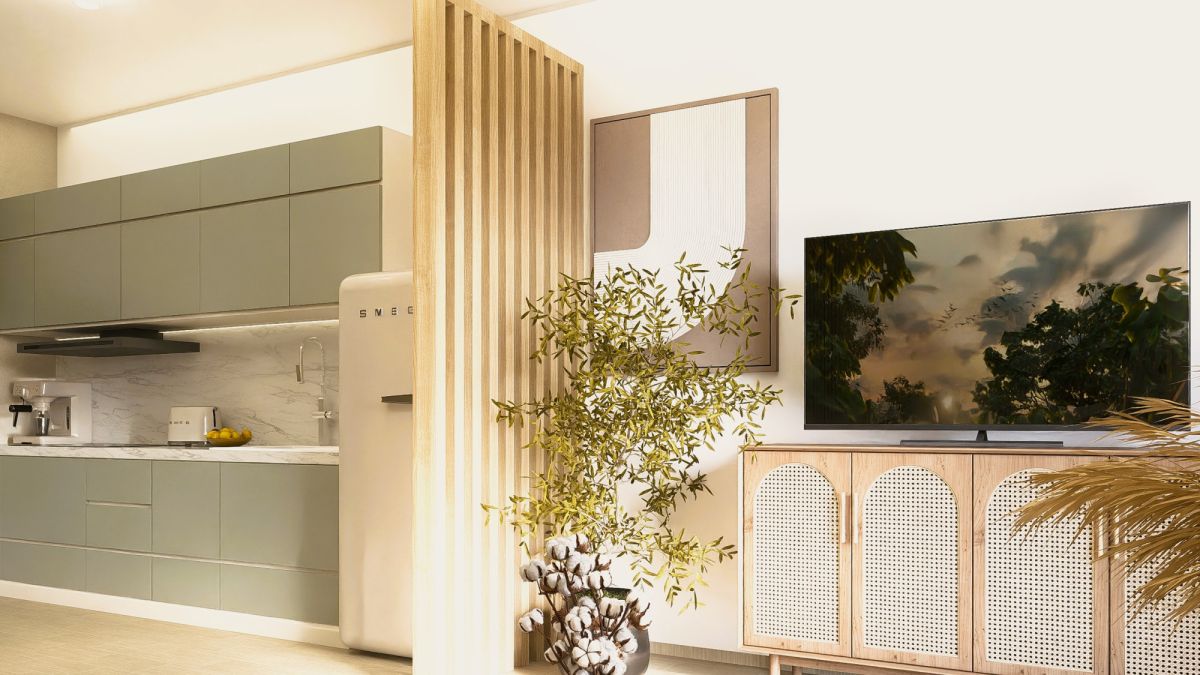 Apartament o powierzchni 51 m² został zaprojektowany w funkcjonalnym układzie obejmującym salon z otwartą kuchnią, osobną sypialnię oraz łazienkę. Duże przeszklenia i balkon nadają wnętrzu lekkości oraz zapewniają naturalne doświetlenie przez cały dzień. Architektura budynku łączy nowoczesne linie z naturalnymi materiałami, drewnianymi detalami i elementami szkła, tworząc elegancką, a jednocześnie przyjazną przestrzeń do życia.