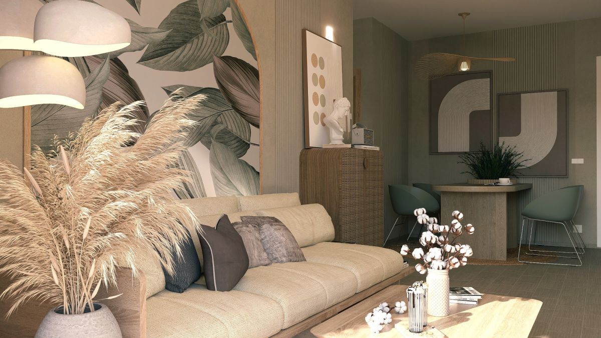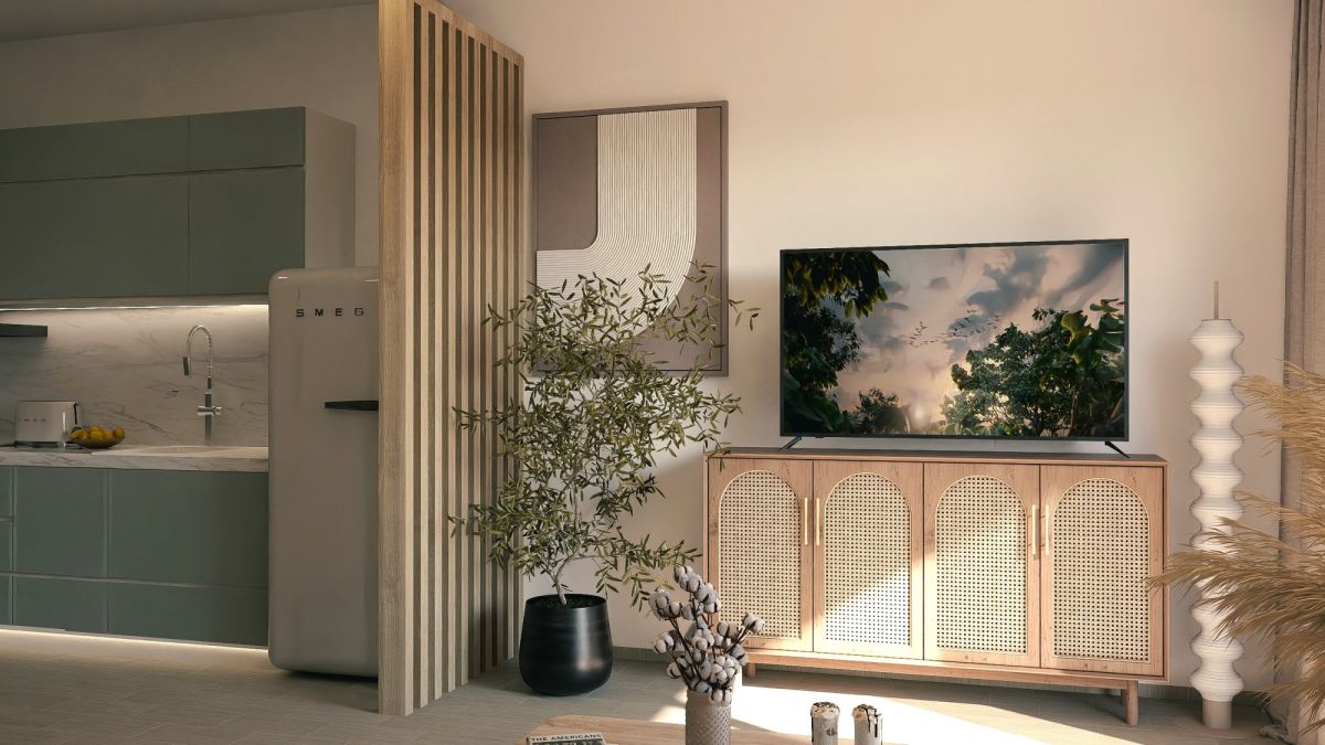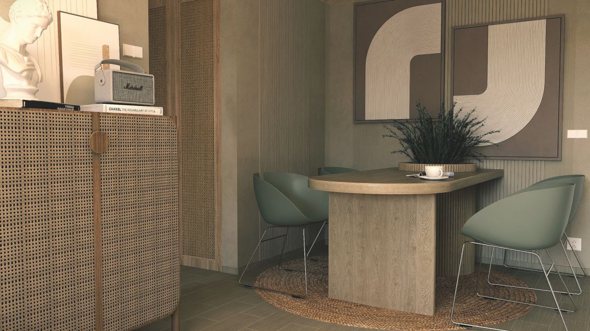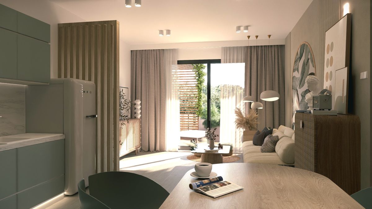Apartament został zaprojektowany w funkcjonalnym układzie obejmującym salon z otwartą kuchnią, 2 sypialni oraz 2 łazienki. Duże przeszklenia i balkon nadają wnętrzu lekkości oraz zapewniają naturalne doświetlenie przez cały dzień. Architektura budynku łączy nowoczesne linie z naturalnymi materiałami, drewnianymi detalami i elementami szkła, tworząc elegancką, a jednocześnie przyjazną przestrzeń do życia.