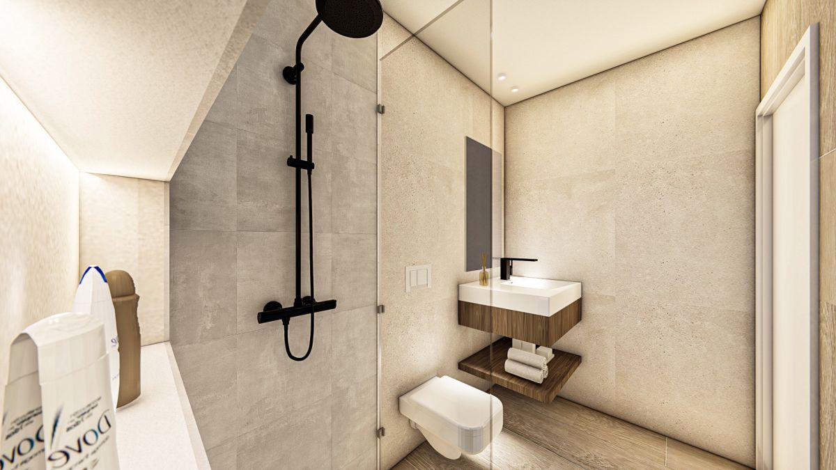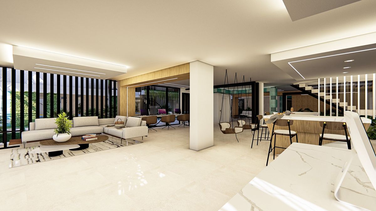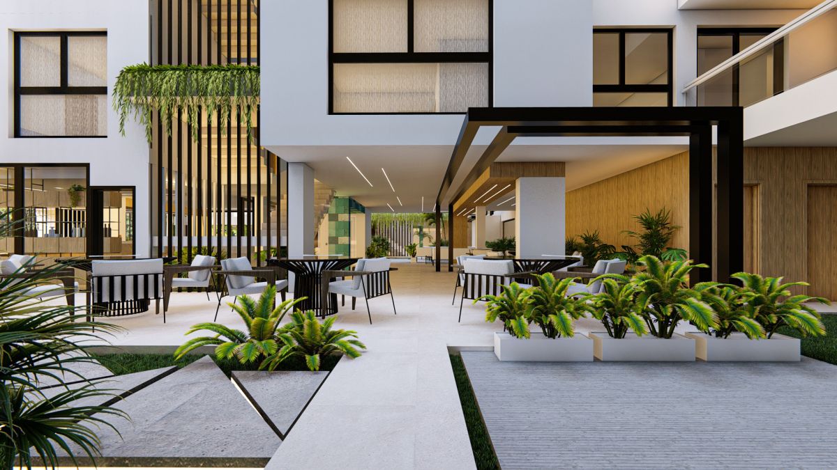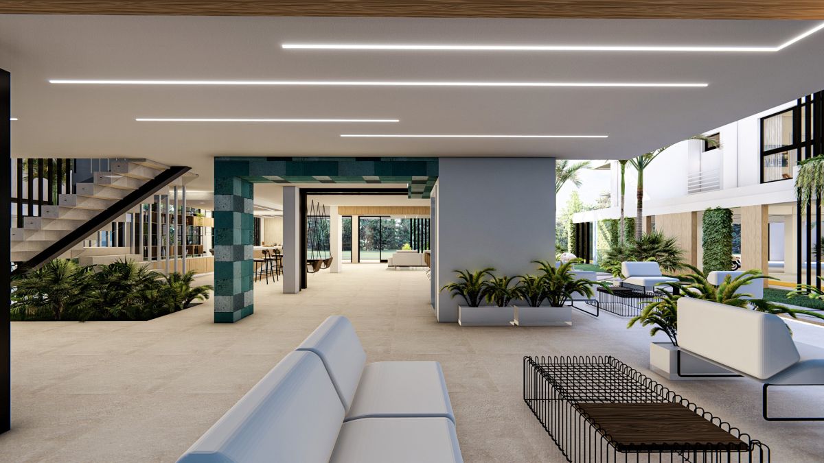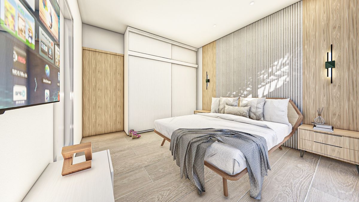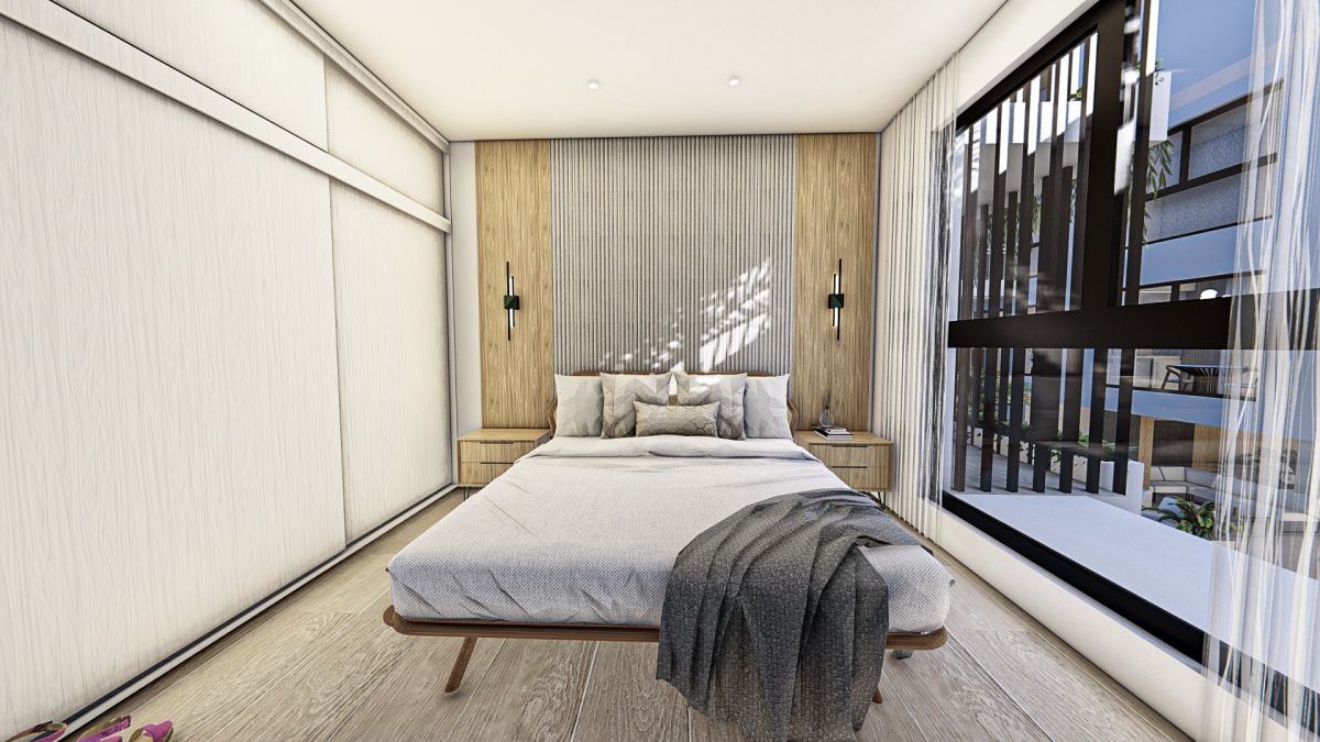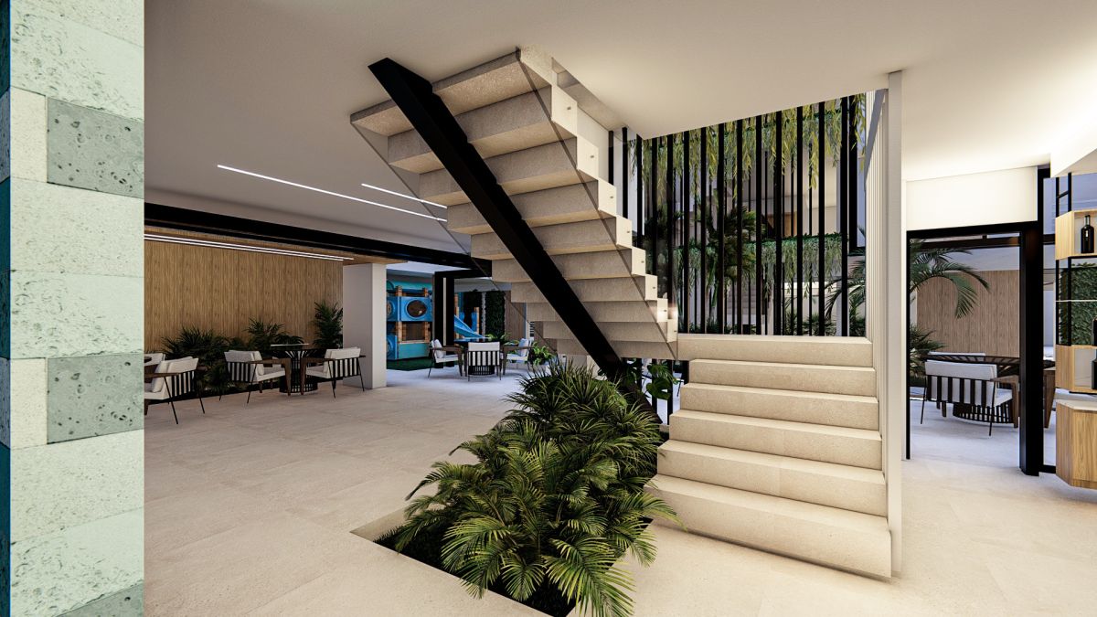 Apartament o powierzchni 85 m² oferuje przemyślany układ pomieszczeń rozłożony na dwóch kondygnacjach. Wnętrze składa się z przestronnego salonu połączonego z aneksem kuchennym, dwóch komfortowych sypialni oraz dwóch nowoczesnych łazienek. Duże przeszklenia zapewniają doskonałe doświetlenie wnętrz oraz płynne przejście na prywatny balkon, z którego można cieszyć się tropikalnym klimatem.