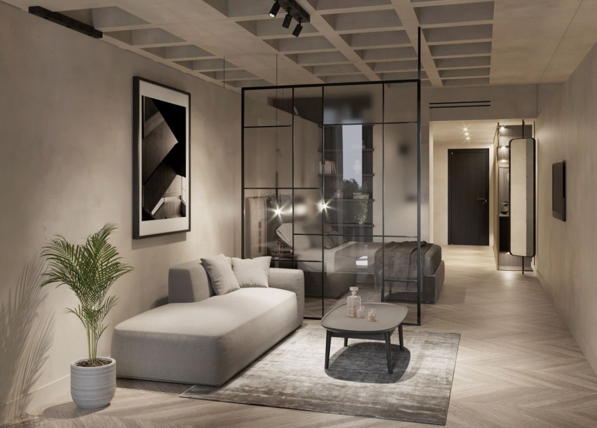Mieszkanie typu open space na 1. piętrze ma powierzchnię 63 m2. w tym 9 mkw. Znajduje się w nim mała kuchnia, sypialnia, część wypoczynkowa oraz łazienka. Mieszkanie będzie całkowicie umeblowane. Podłoga będzie drewniana, za wyjątkiem przestrzeni łazienkowej, gdzie została wykonana z płytek ceramicznych. Ściany pomalowane są na jasne kolory. Mieszkanie tego typu posiada prywatny balkon od ulicy dostępny z dużych okien drzwiowych.