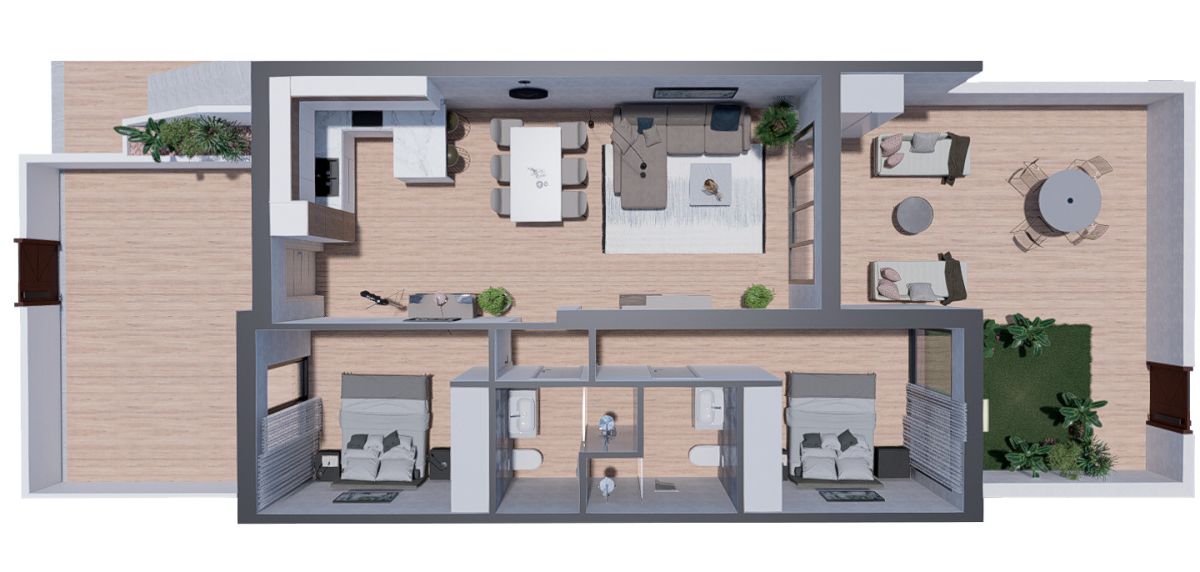 Nieruchomość obejmuje przestronny salon z aneksem kuchennym, dwie sypialnie oraz dwie funkcjonalne łazienki. Dużym atutem są dwa tarasy - pierwszy o powierzchni 25,35 m², drugi 31,40 m² - które tworzą wyjątkową przestrzeń do relaksu i spotkań na świeżym powietrzu.