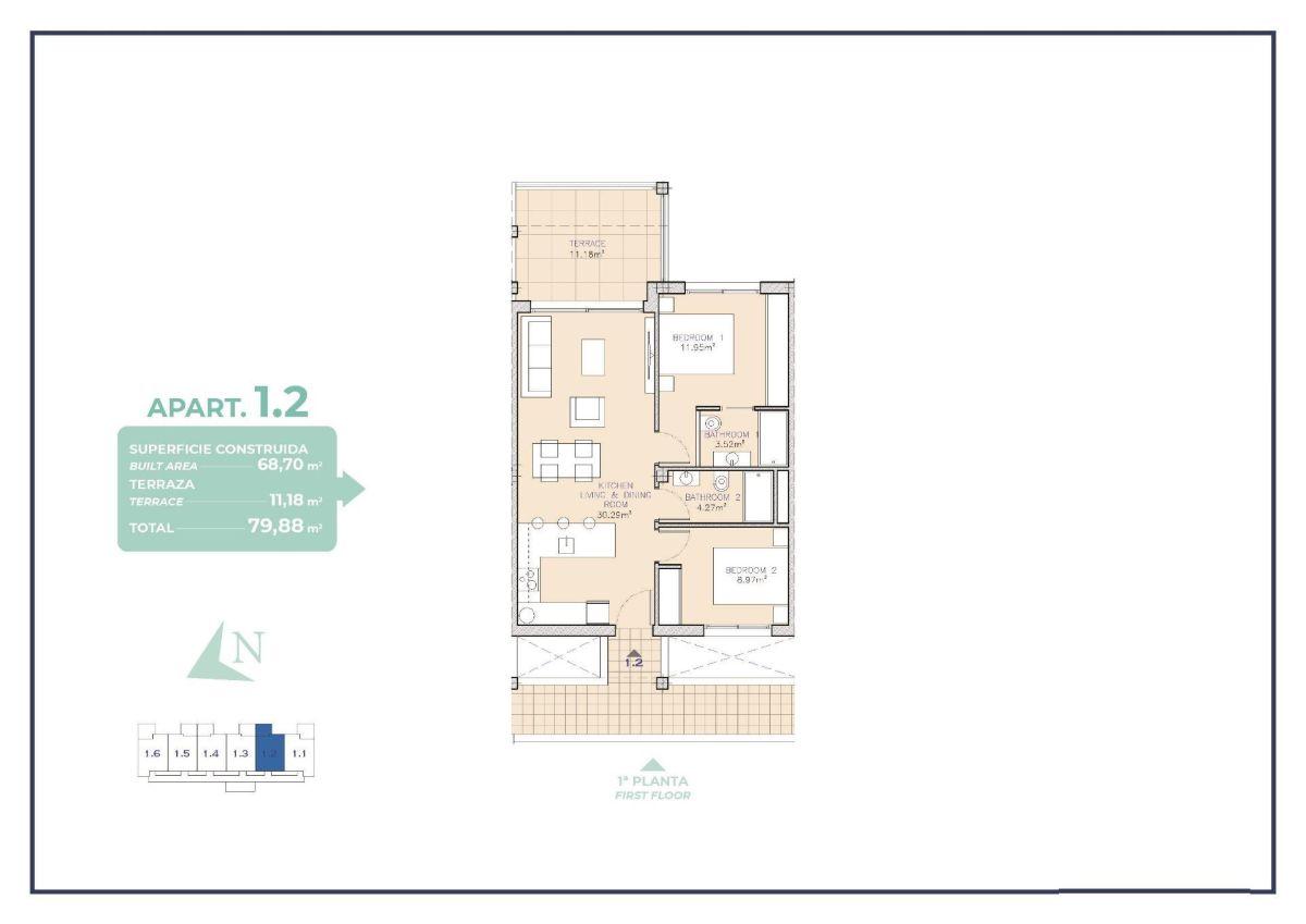 Ten nowoczesny apartament o powierzchni 80m2 zlokalizowany jest w pięknej okolicy, z przepięknym widokiem na pole golfowe i morze. Apartament składa się z dwóch sypialni, dwóch łazienek, przestronnego salonu z aneksem kuchennym oraz dużego tarasu, z którego rozciąga się zapierający dech w piersiach widok na otaczającą przyrodę.