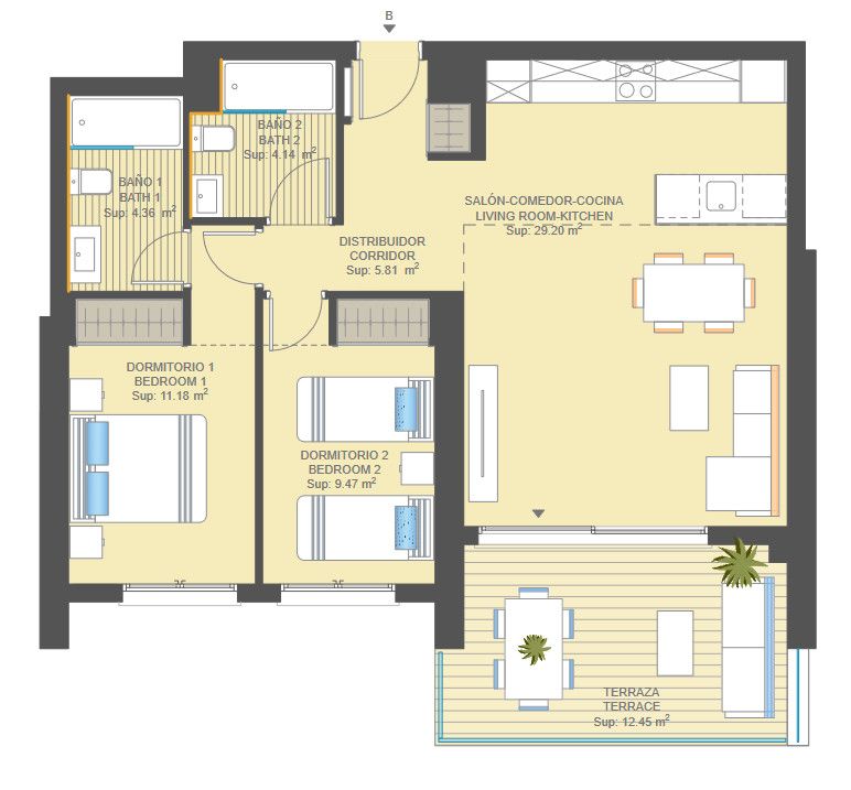Nowoczesny apartament o powierzchni 99m2, składa się z dwóch wygodnych sypialni, 2 łazienek, przestronnego i designerskiego salonu połączonego z w pełni wyposażoną w najnowocześniejsze AGD kuchni, oraz tarasu z widokiem.