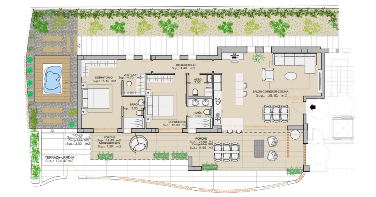 Wnętrze obejmuje 2 przestronne sypialnie i 2 nowoczesne łazienki oraz jasny salon połączony z jadalnią i kuchnią. Dom został zaprojektowany z myślą o funkcjonalności i maksymalnym doświetleniu pomieszczeń. Na zewnątrz znajduje się prywatny basen z jacuzzi, a duży taras z ogrodem zapewnia przestrzeń do relaksu, spotkań i wypoczynku na świeżym powietrzu.