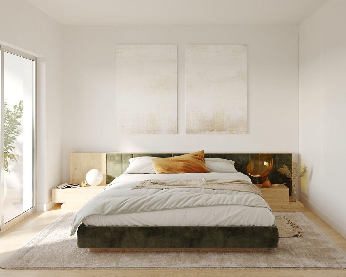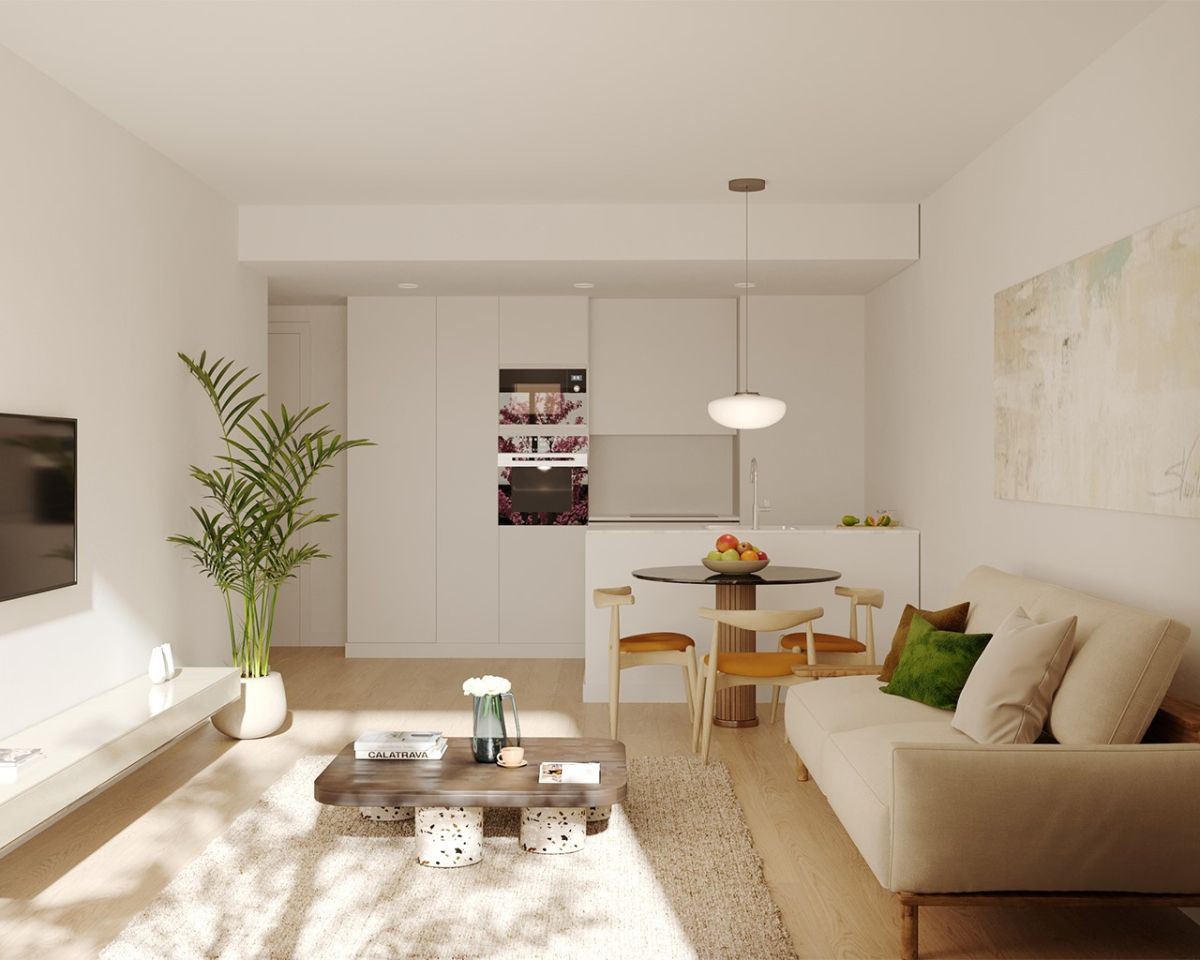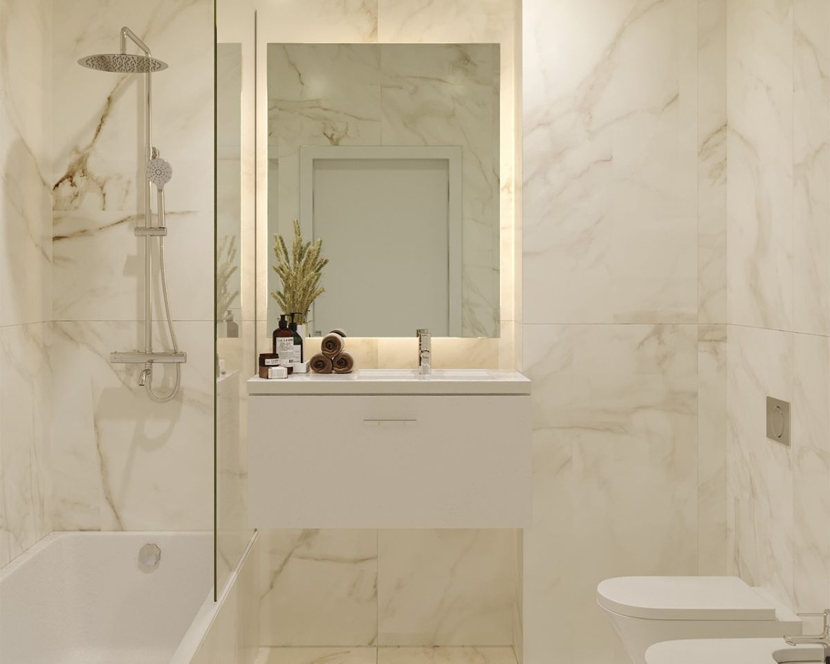 Mieszkanie z 1 sypialnią, dużym salonem i w pełni wyposażoną kuchnią typu open-space, sypialnią z garderobą i kompletnie wyposażoną łazienką.