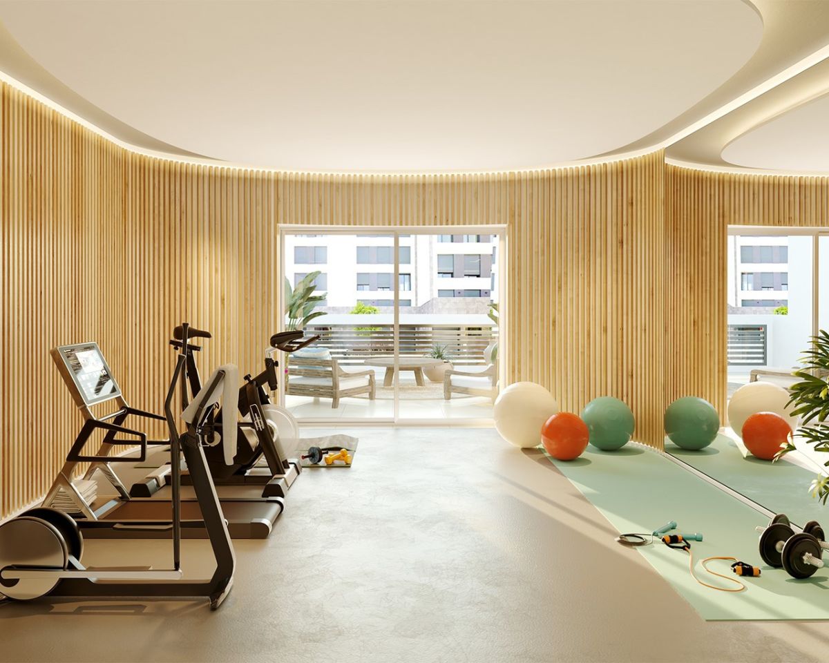 Apartamentowiec posiada 2 baseny typu infinity (dla dorosłych i dzieci) na dachu, szeroki taras z miejscami do wypoczynku, z którego można podziwiać niesamowity widok na Ria Formosa, lotnisko i miasto, a na parterze znajduje się salon ze sprzętem do ćwiczeń cardio i strefa co-livingu.
