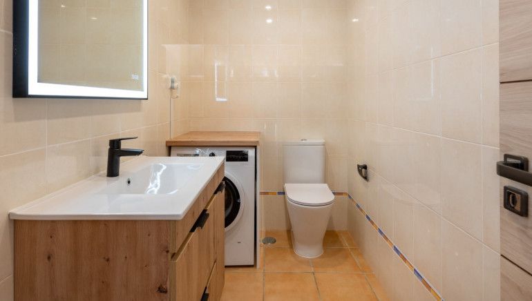 Po wejściu do mieszkania wita nas przestronny hall, który prowadzi do salonu z balkonem z widokiem na morze oraz oddzielnej, nowej, w pełni wyposażonej kuchni. Na dolnym poziomie apartamentu znajdują się trzy sypialnie - główna z prywatną łazienką, a pozostałe dwie dzielą drugą łazienkę. Wszystkie trzy sypialnie mają prywatne balkony, oferując jasne, przestronne pomieszczenia z bezpośrednim dostępem na zewnątrz.