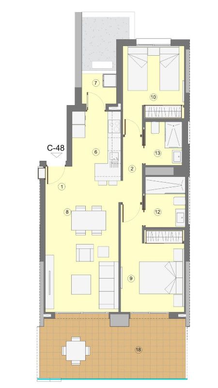 Na sprzedaż apartament w prestiżowym kompleksie, położony na 6. piętrze. Mieszkanie składa się z 2 sypialni i 2 łazienek, o łącznej powierzchni 97 m², z czego 78 m² to część mieszkalna i 19 m² stanowi taras. Orientacja południowa, z widokiem na ulicę i osiedle.